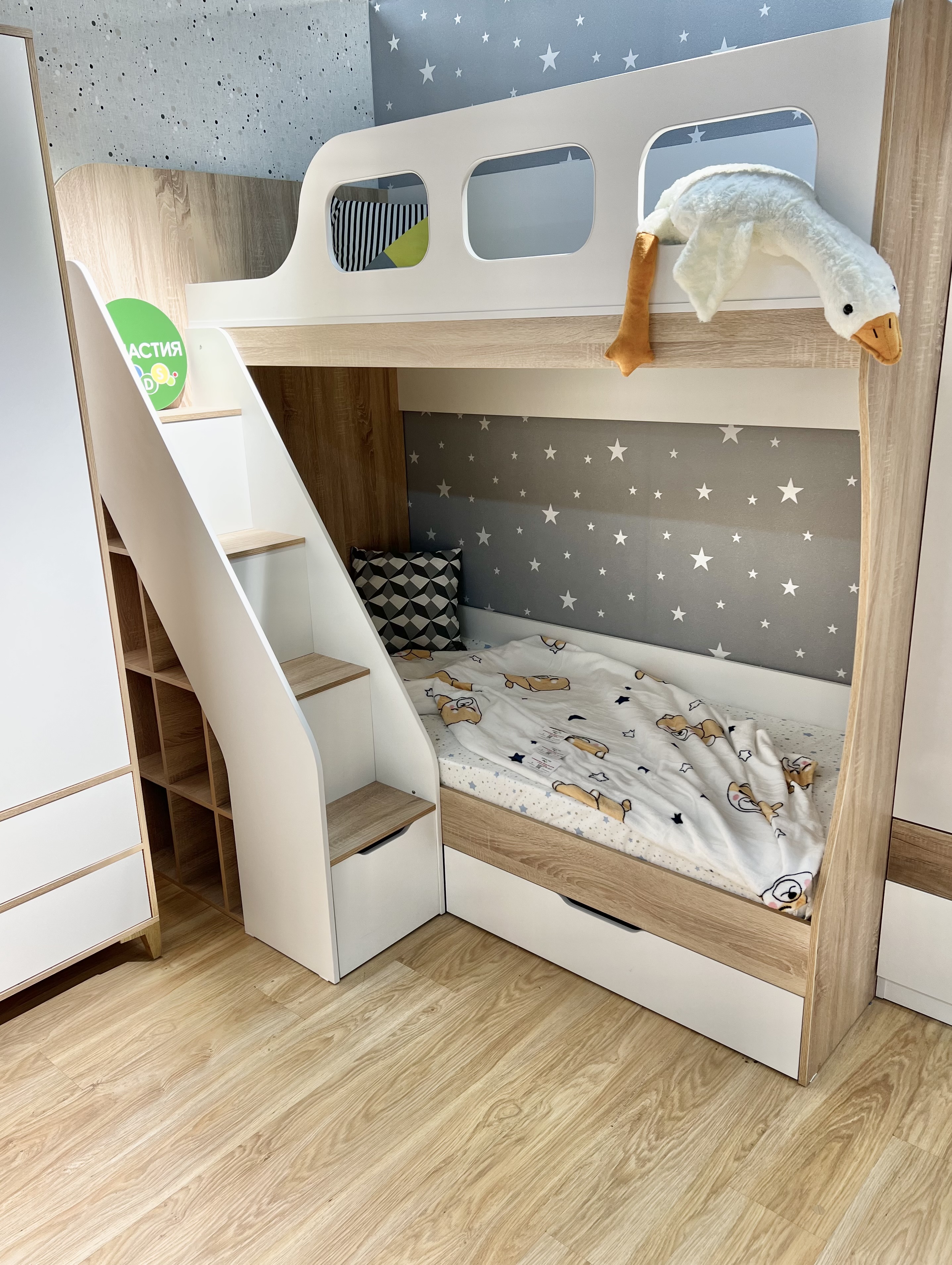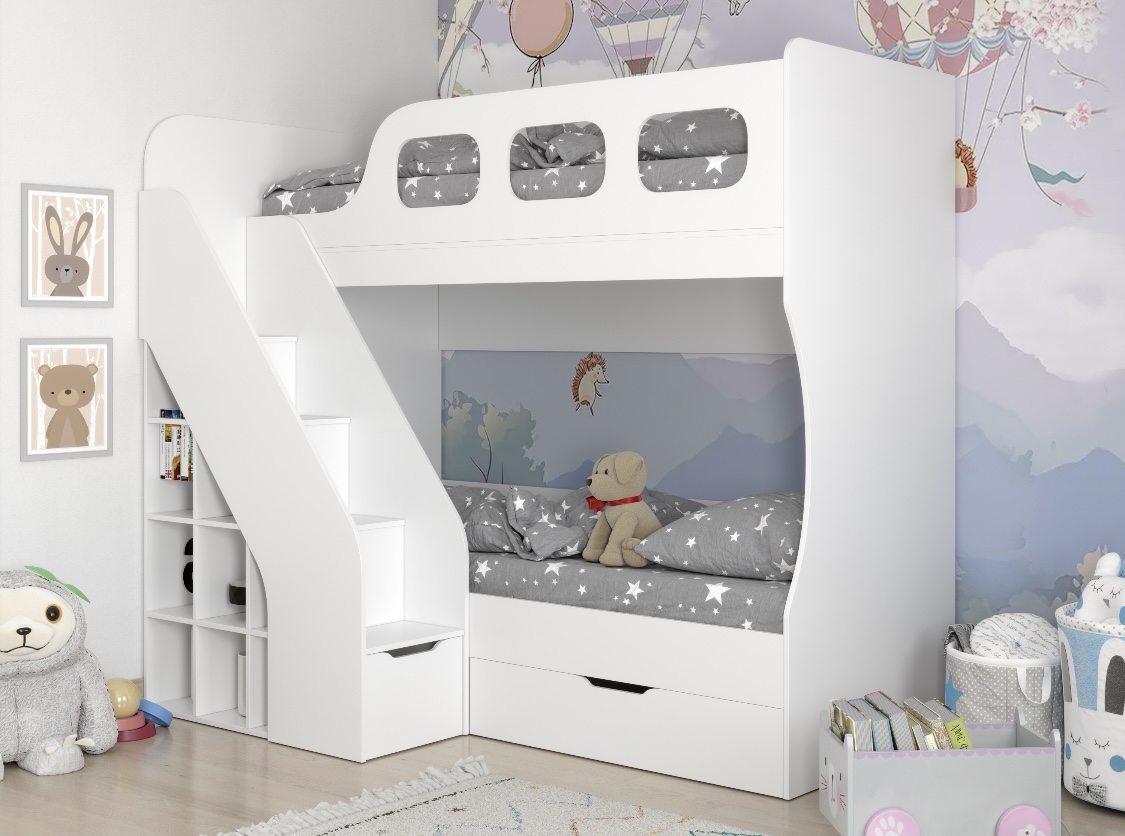 Удобная, безопасная лестница со встроенными полочками для книг и игрушек и комфортная высота кровати.