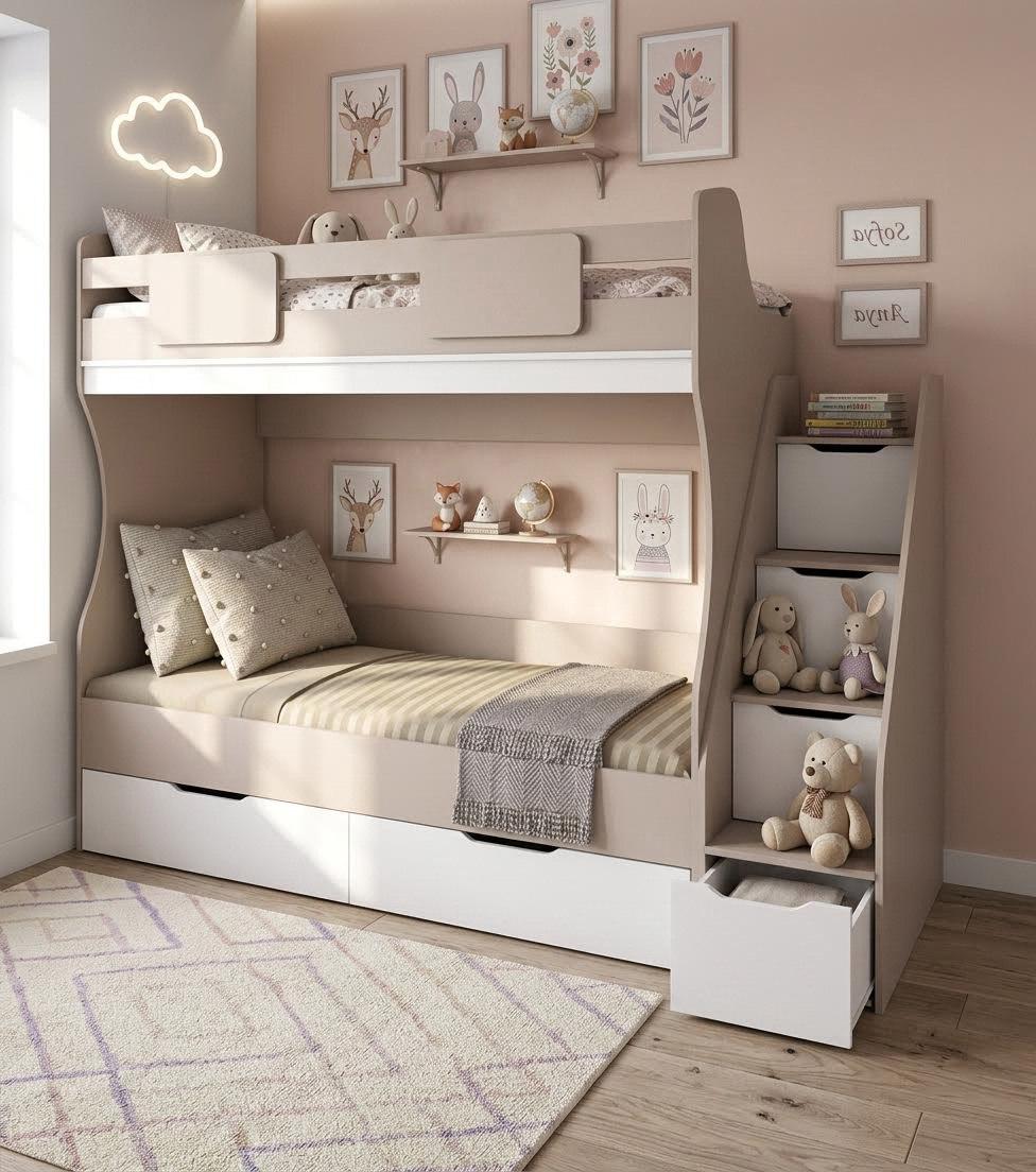 Кровать имеет также два выдвижных ящика для хранения белья или игрушек с доводчиками.