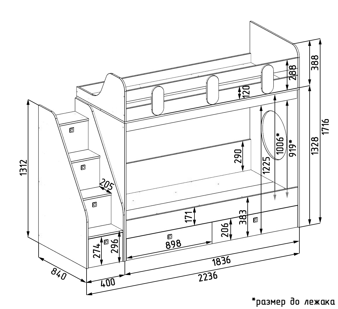 Габариты кровати с учетом лестницы: ширина 2236 х высота 1716 х глубина 840