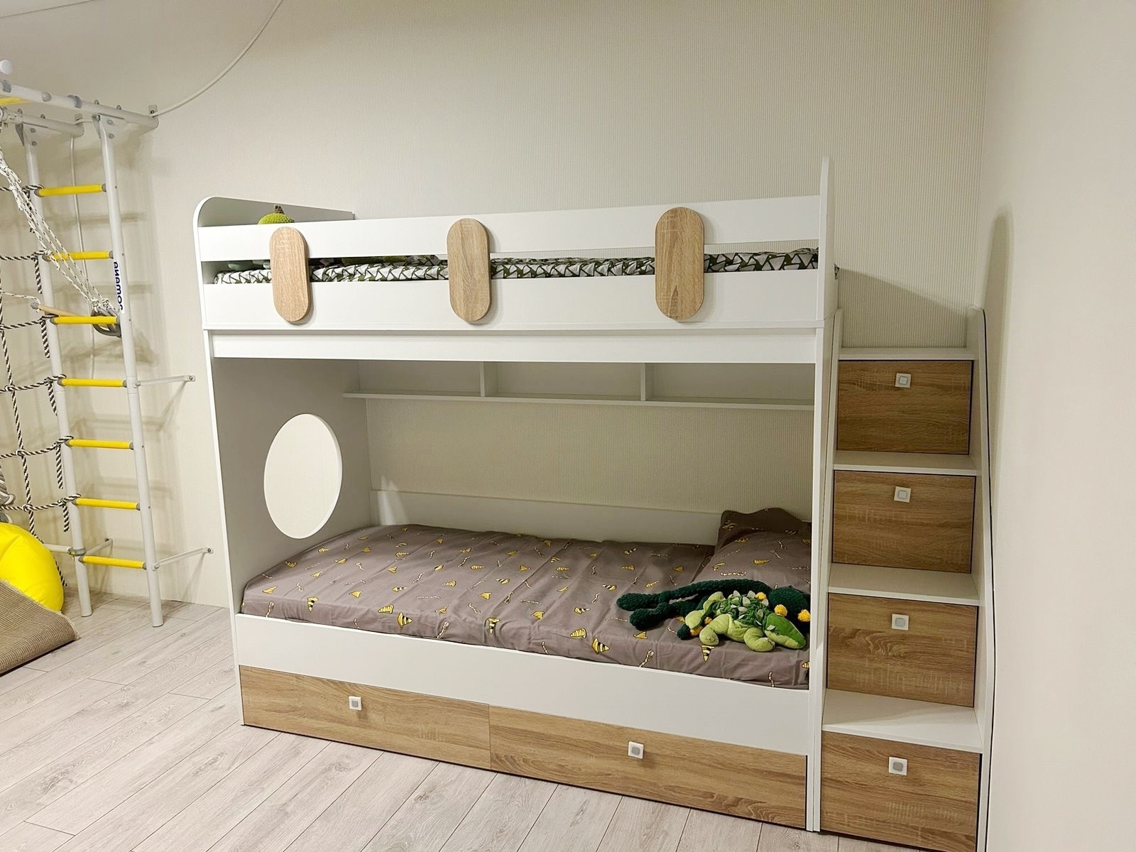 В лестницу встроены ящики для игрушек.