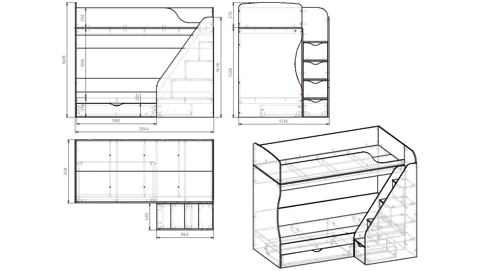 Габариты кровати: ширина 2044, глубина с учетом лестницы 1336, высота 1698 мм