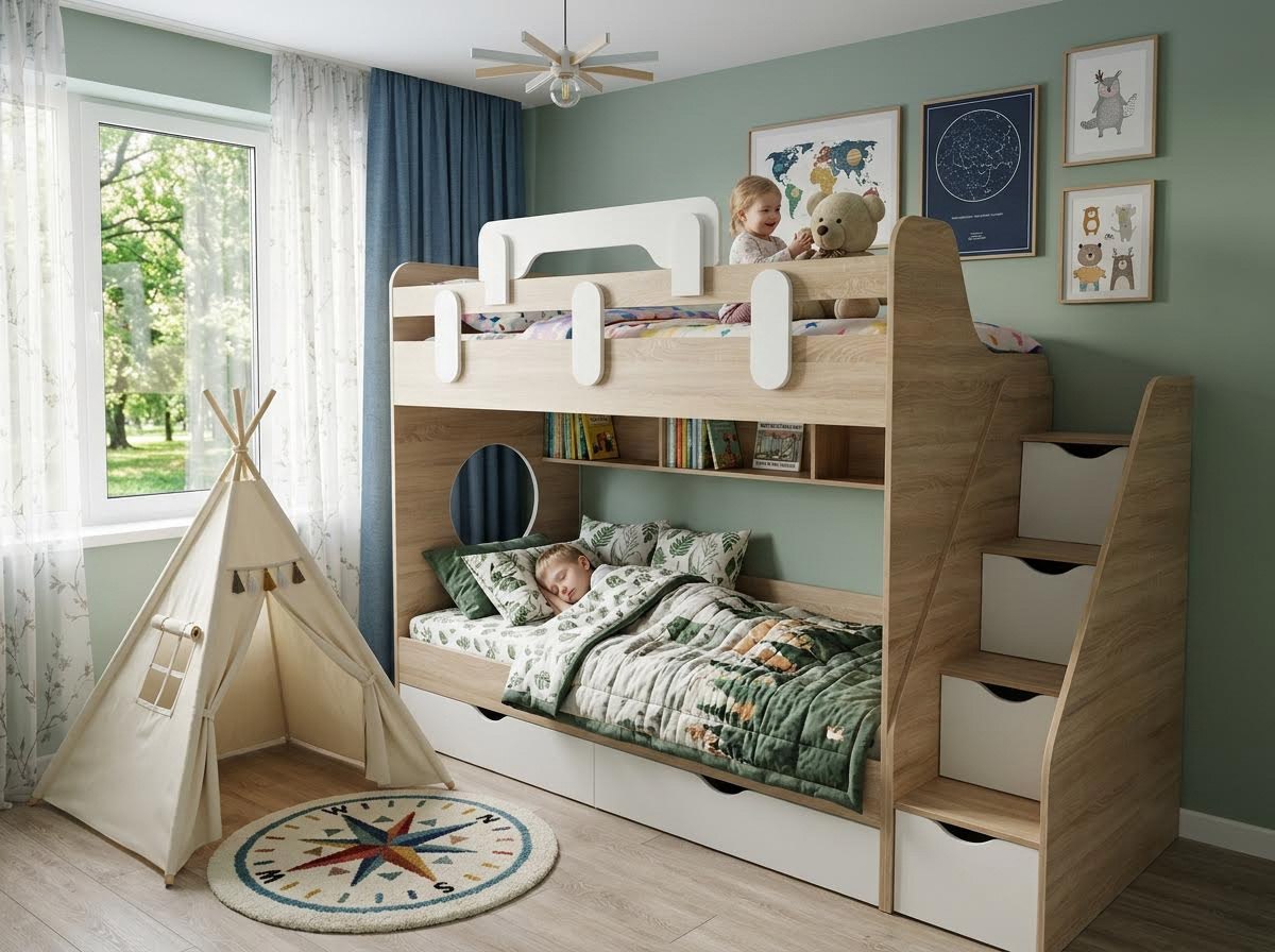 Прочная конструкция кровати выдерживает нагрузку до 150 кг на каждое спальное место.