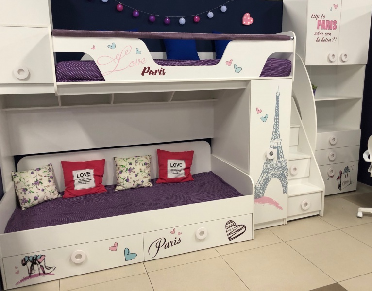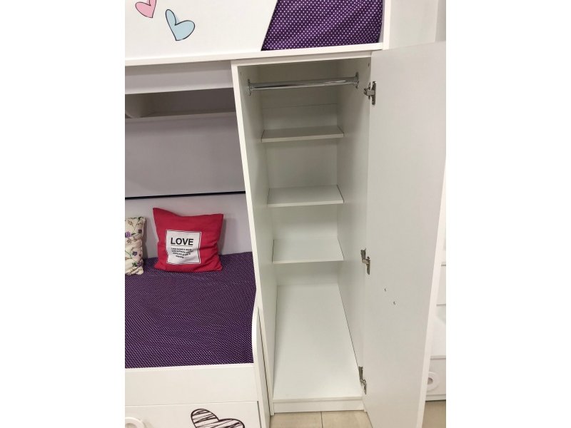 В кровать встроен шкаф для размещения одежды (внутри шкафа имеются штанга для белья и полки) и удобная лестница с ящиками для игрушек.