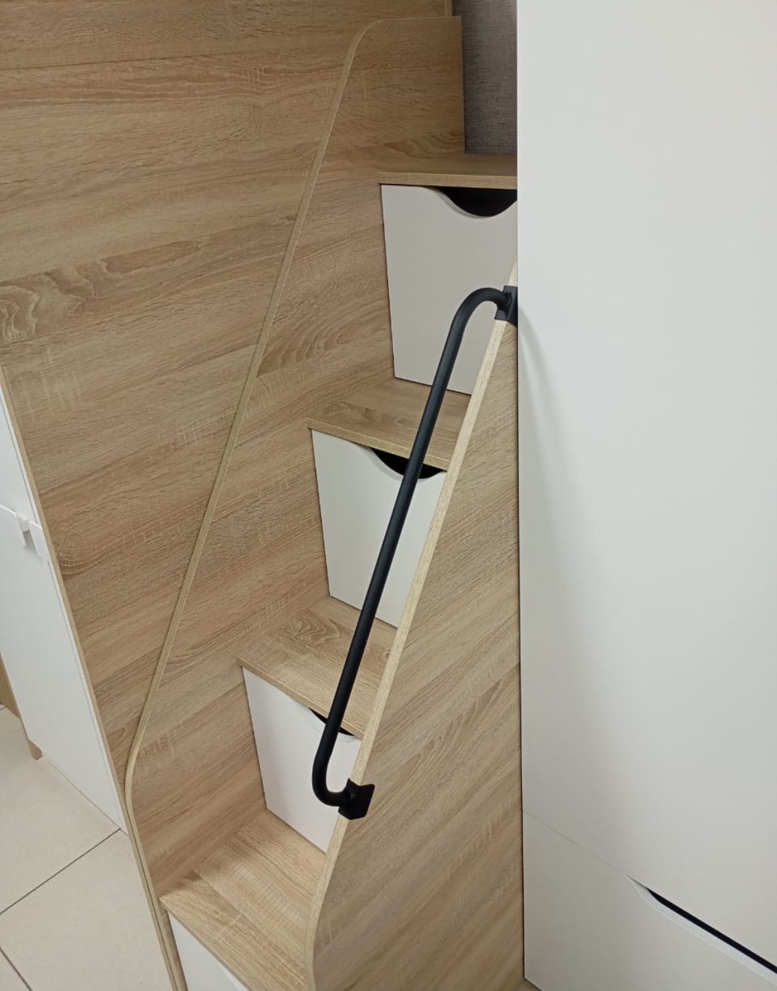 Поручень крепится к лестнице или бортику кровати в вертикальном или горизонтальном положении в зависимости от конструктивных особенностей мебели и удобства пользования.