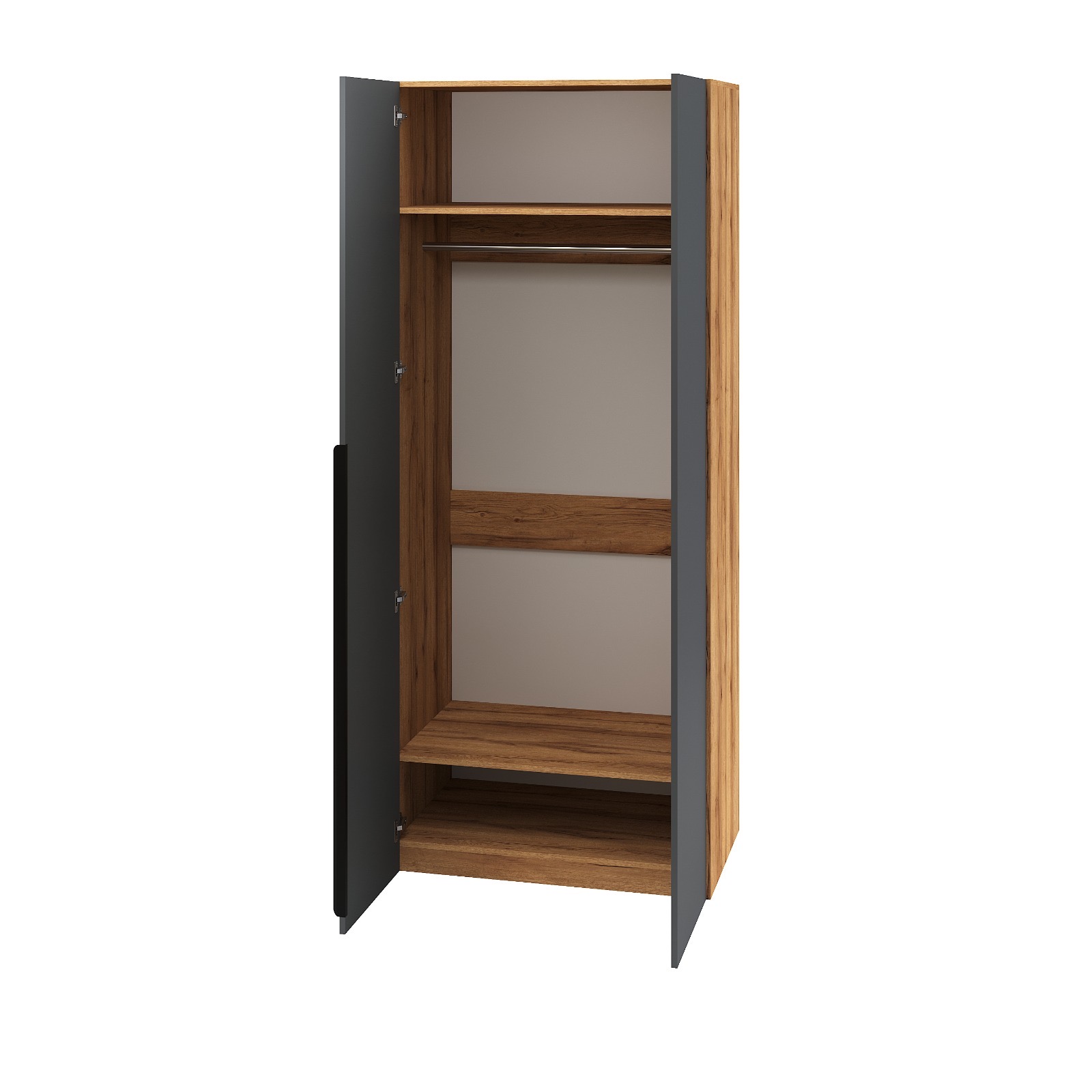 ЛДСП Е0,5. Толщина 16 мм. Доступна в цветах: корпус белый + фасады графит, корпус белый + фасады дуб золотистый, корпус дуб золотистый + фасады графит, полностью белый или полностью велюр