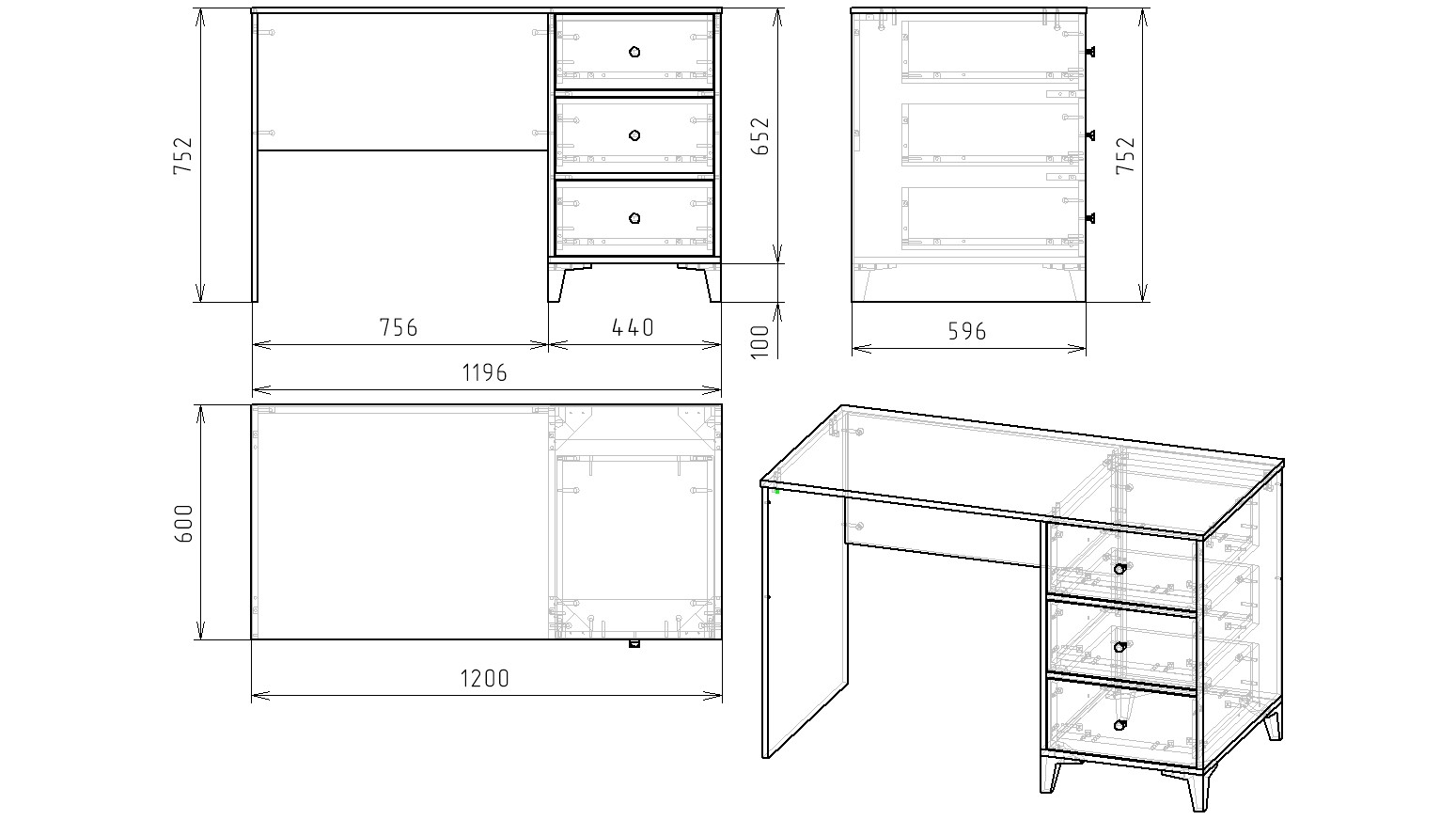 Габариты стола: ширина 1200, глубина 600, высота 752 мм
