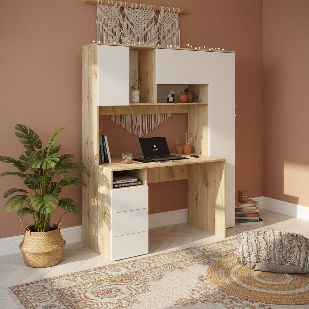 Просторная поверхность, удобные полки и ящики позволят разместить учебники, книги и канцелярию.