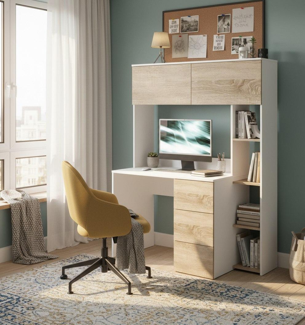 Просторная поверхность, удобные полки и ящики позволят разместить учебники, книги и канцелярию.