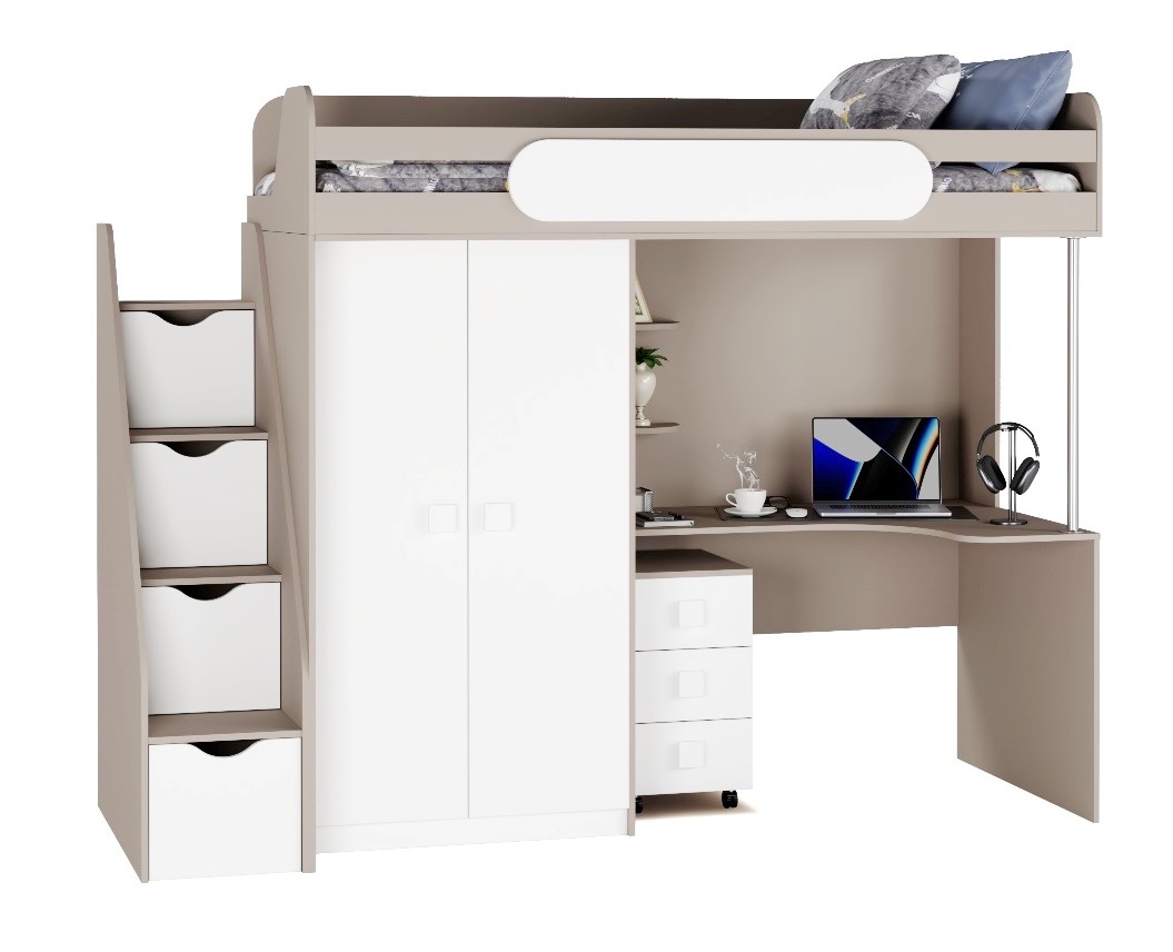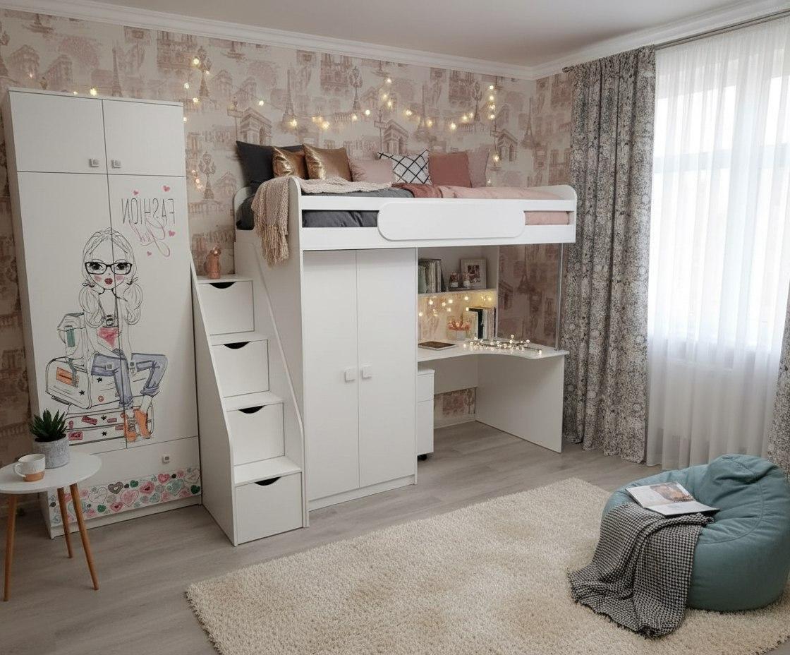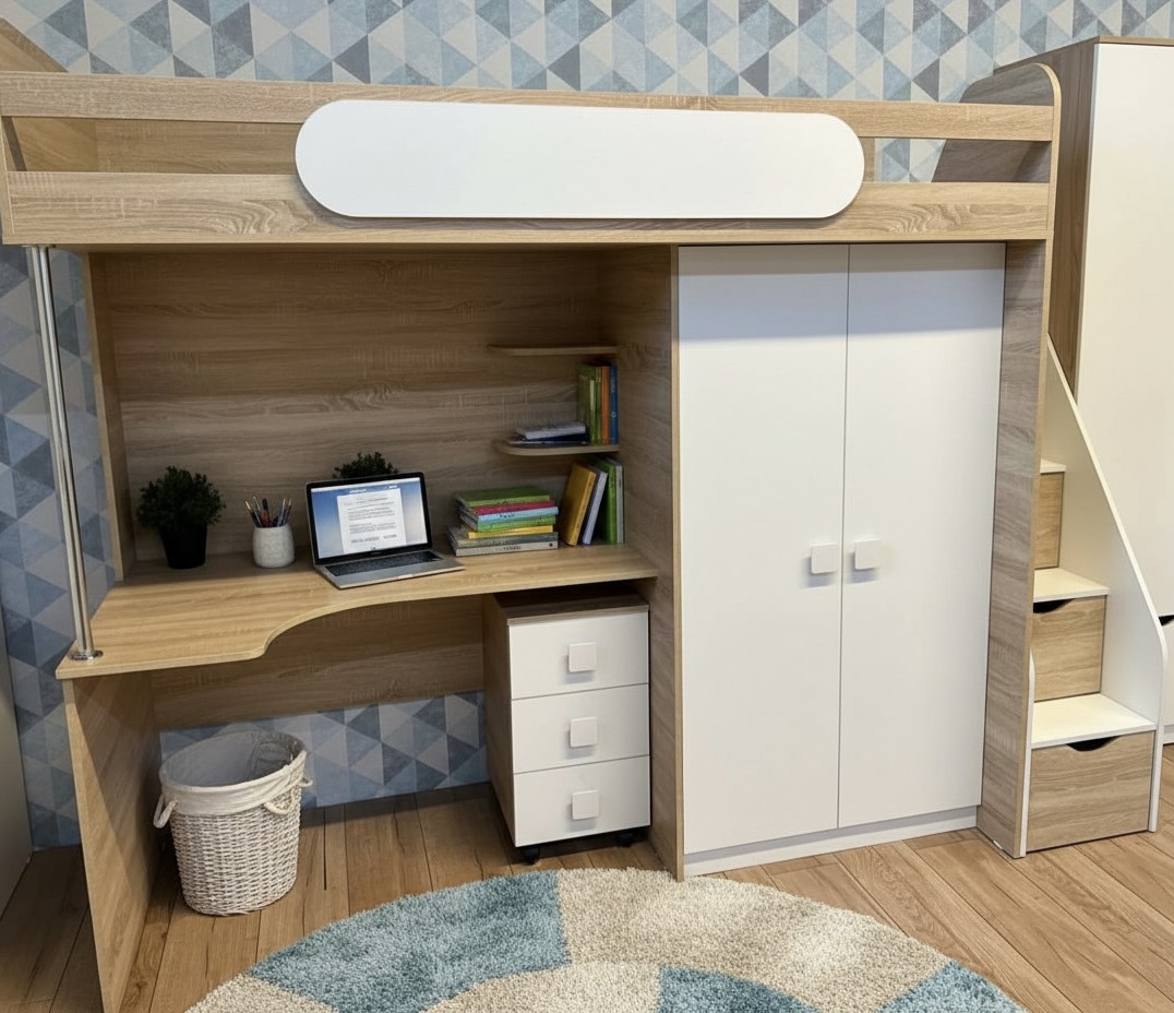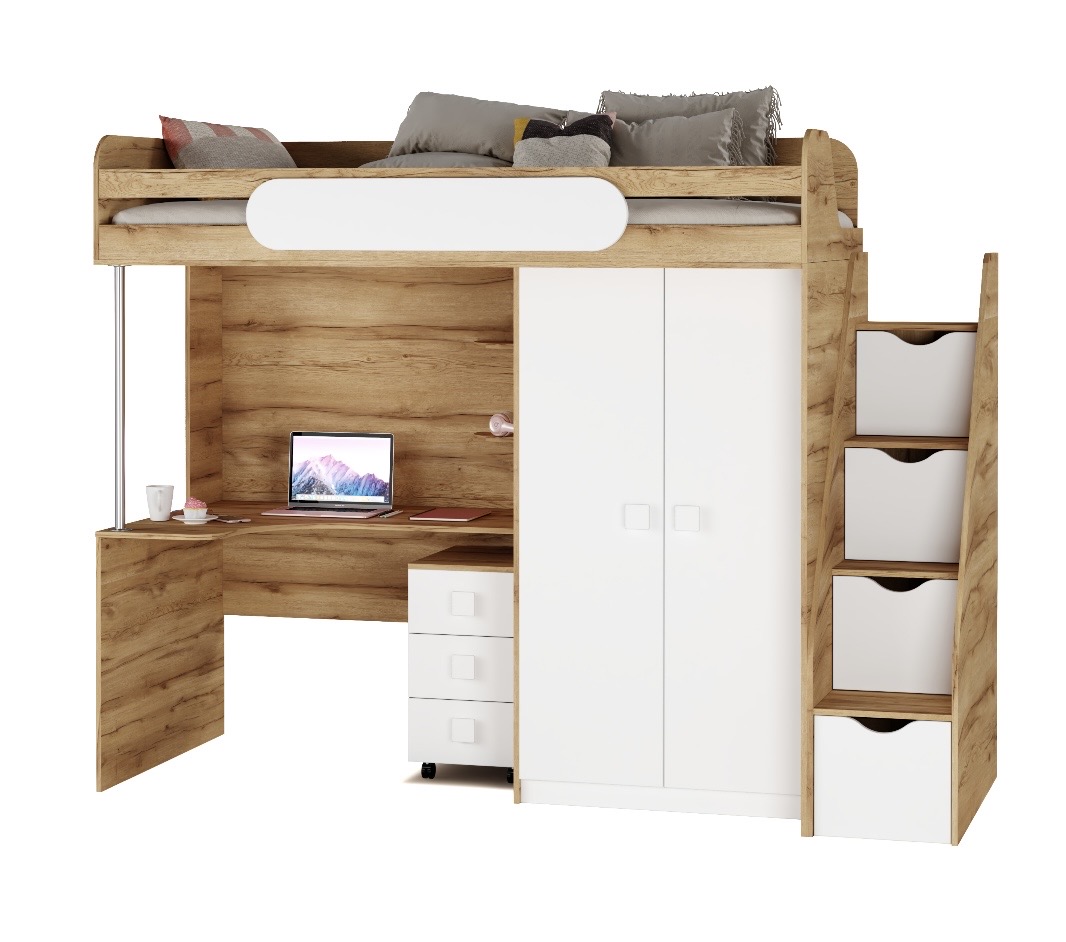 Экономия пространства: под кроватью расположен стол с тумбой для учебы и удобная полочка, а рядом – шкаф для хранения вещей.