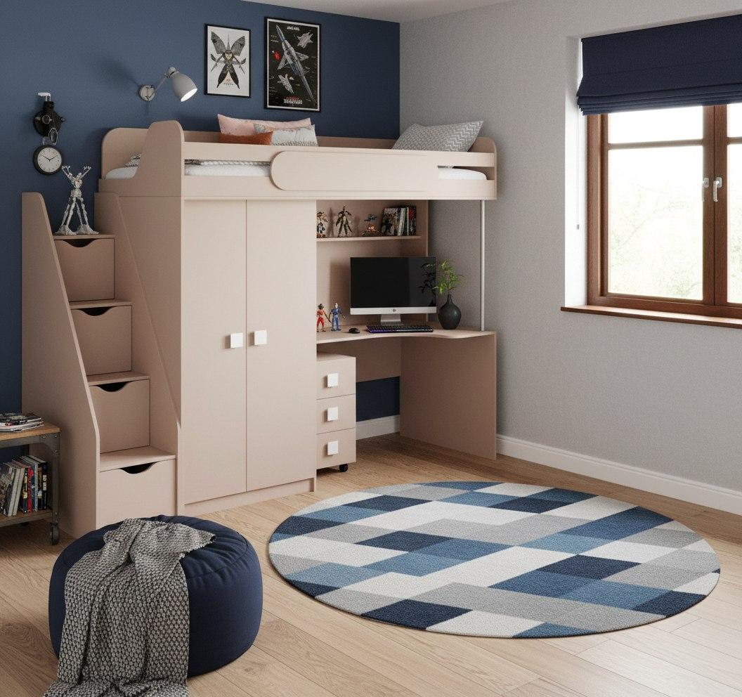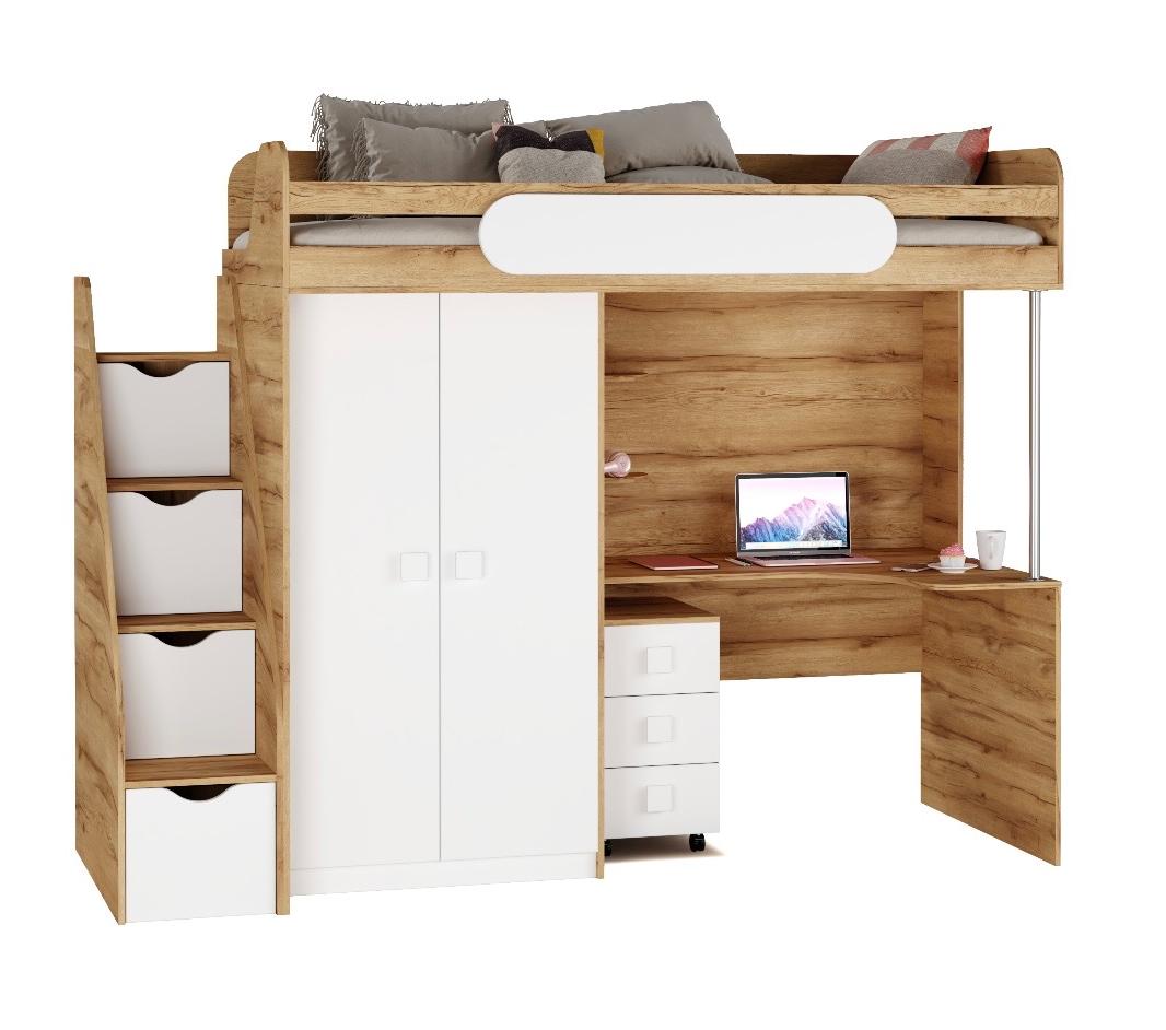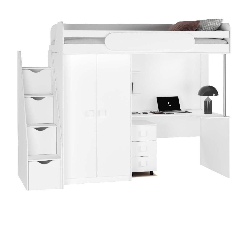 Экономия пространства: под кроватью расположен стол с тумбой для учебы и удобная полочка, а рядом – шкаф для хранения вещей.