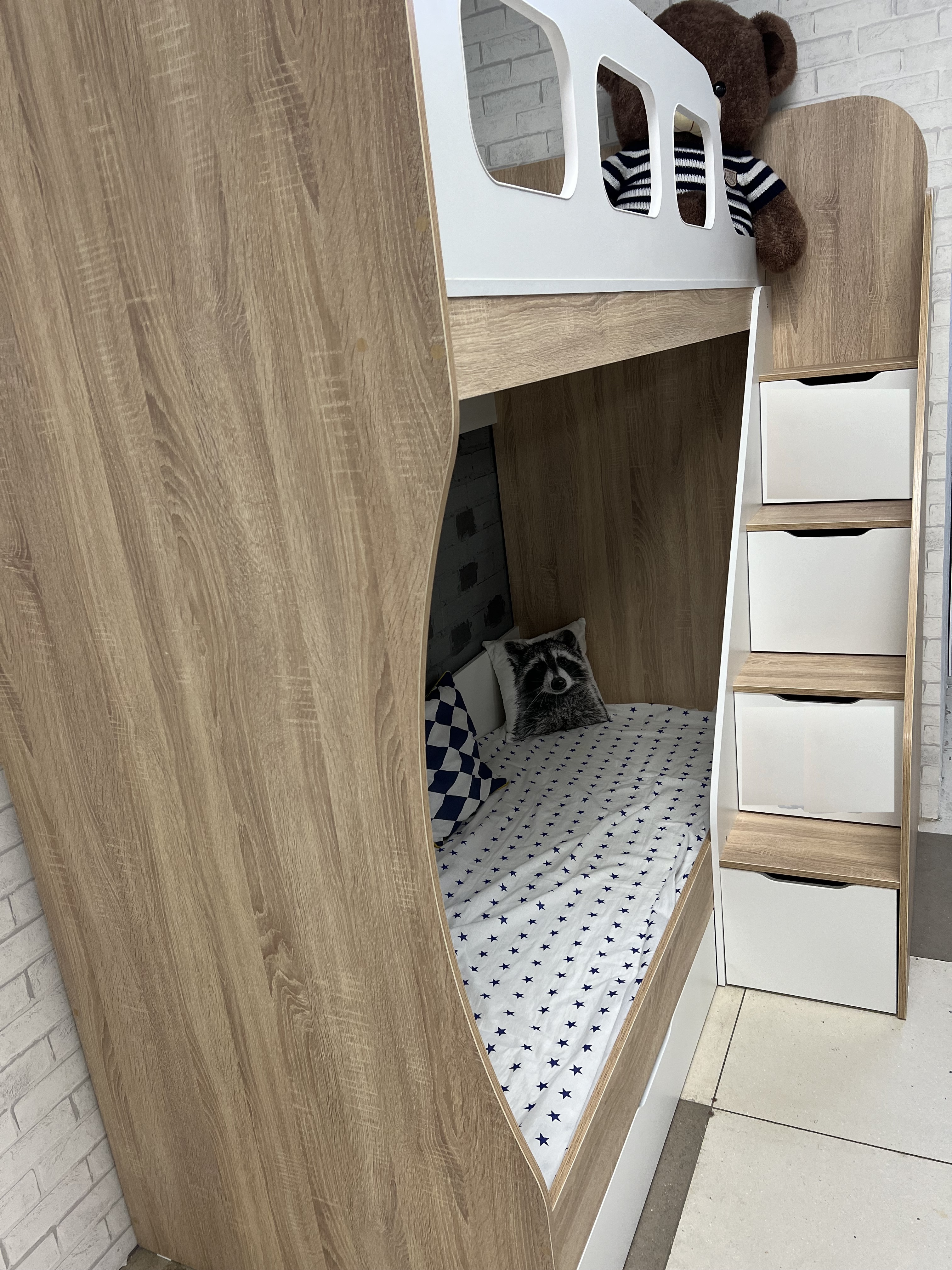 Высокая нагрузка на спальные места. Удобная лестница с ящиками. Высокий, безопасный бортк