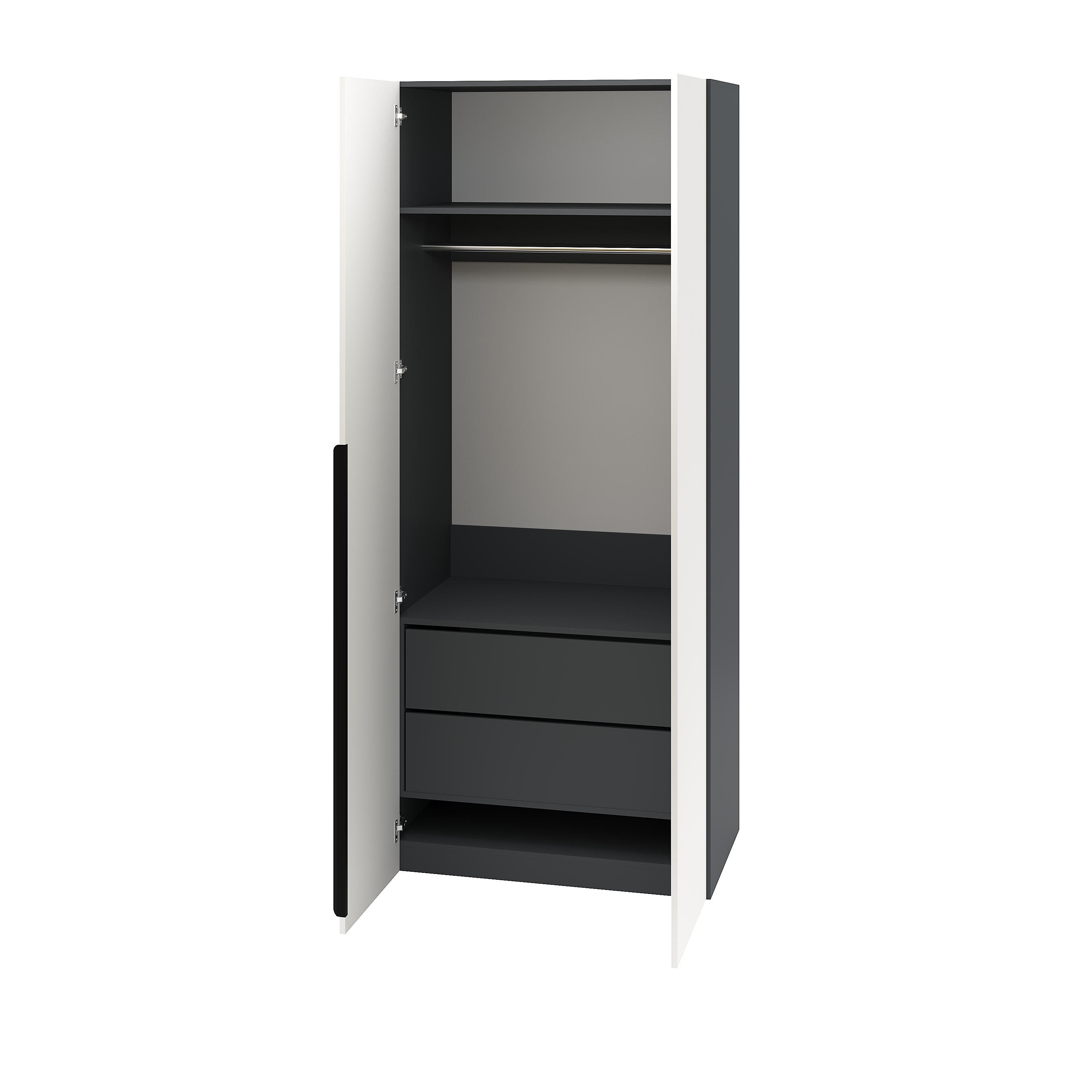 Внутри шкафа расположены вместительный ящик с двумя отделениями, штанга, верхняя и нижняя полки.