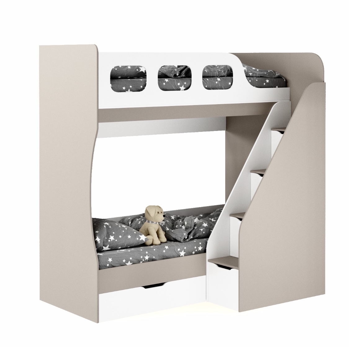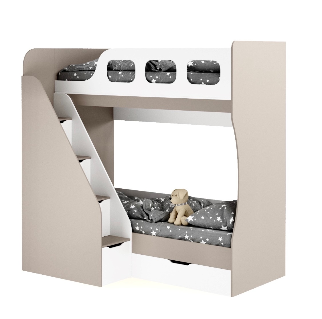 Высокая нагрузка на спальные места. Удобная лестница с ящиками. Высокий безопасный борт