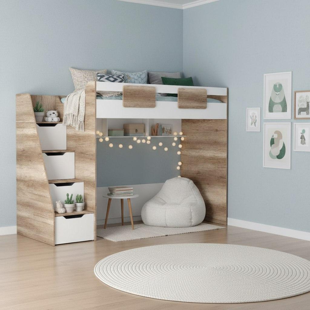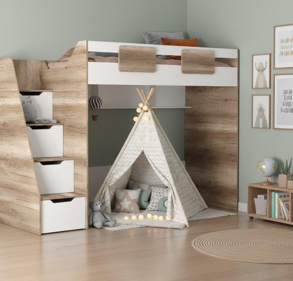 В лестницу встроены выдвижные ящики для игрушек - удобно и практично.