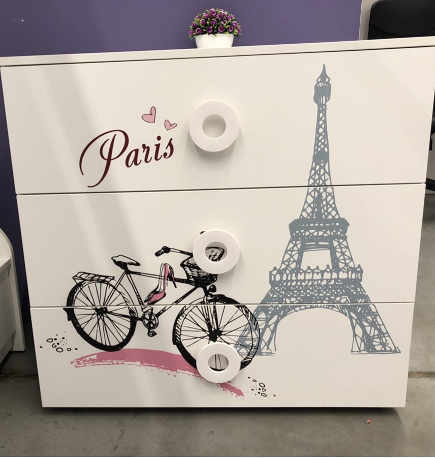 Комод выполнен из сертифицированного, качественного, экологически чистого ЛДСП е0,5 в белом цвете с дизайнерским принтом на фасадах.