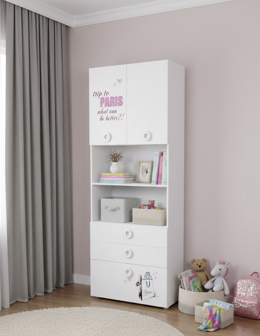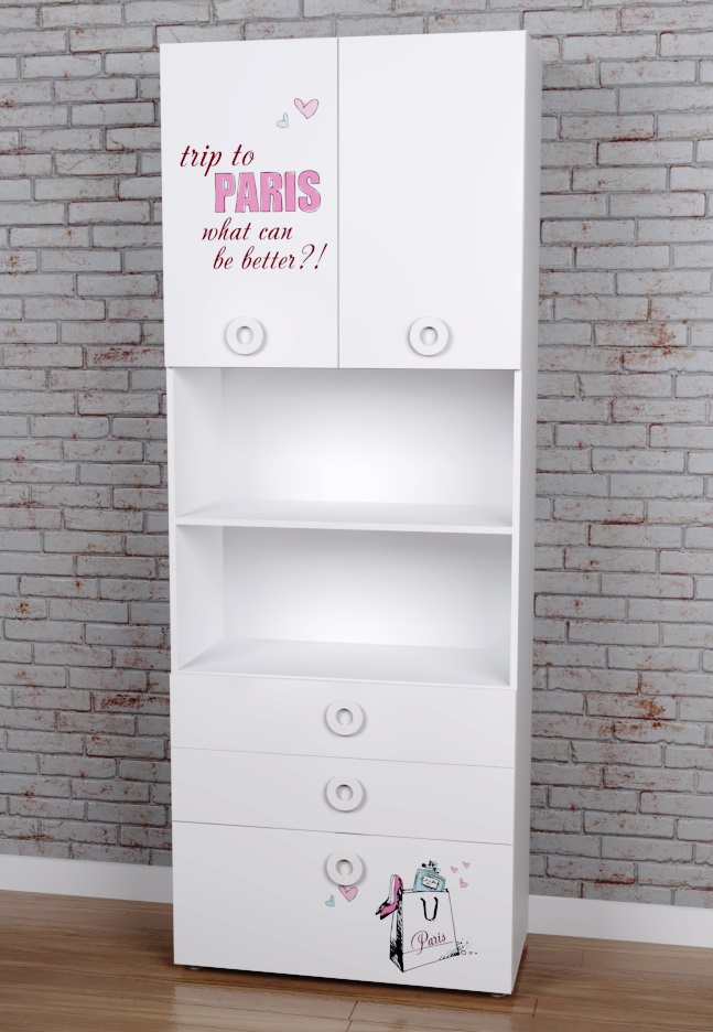 Стеллаж выполнен из сертифицированного, качественного, экологически чистого ЛДСП Е0,5 в белом цвете с принтом.