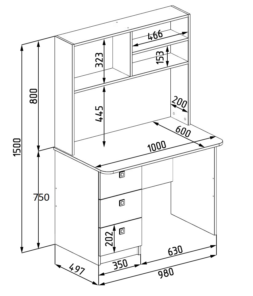 Габариты стола: ширина 1000 х высота до столешницы 750 х глубина 600 мм
