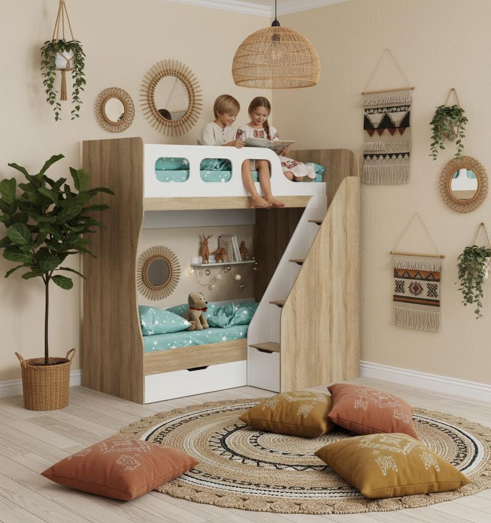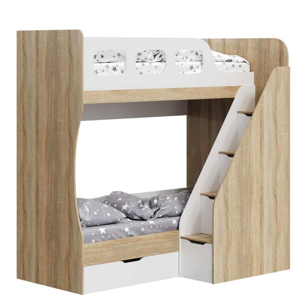 Преимущества данной модели - отлично подходит для небольших помещений, имеет удобную, безопасную лестницу с ящиками для игрушек.