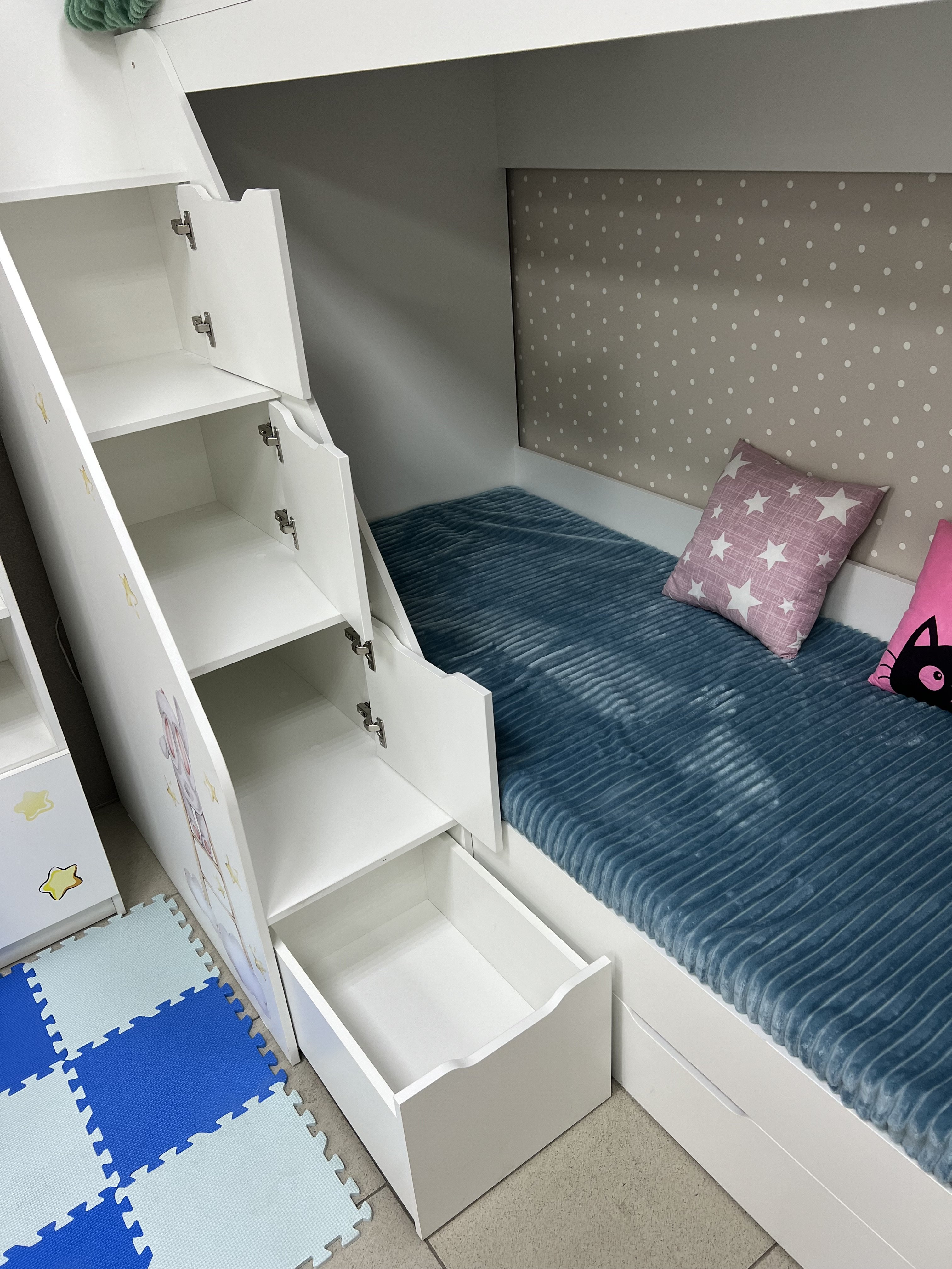 * В нижнюю кровать встроен выдвижной ящик для белья и игрушек.