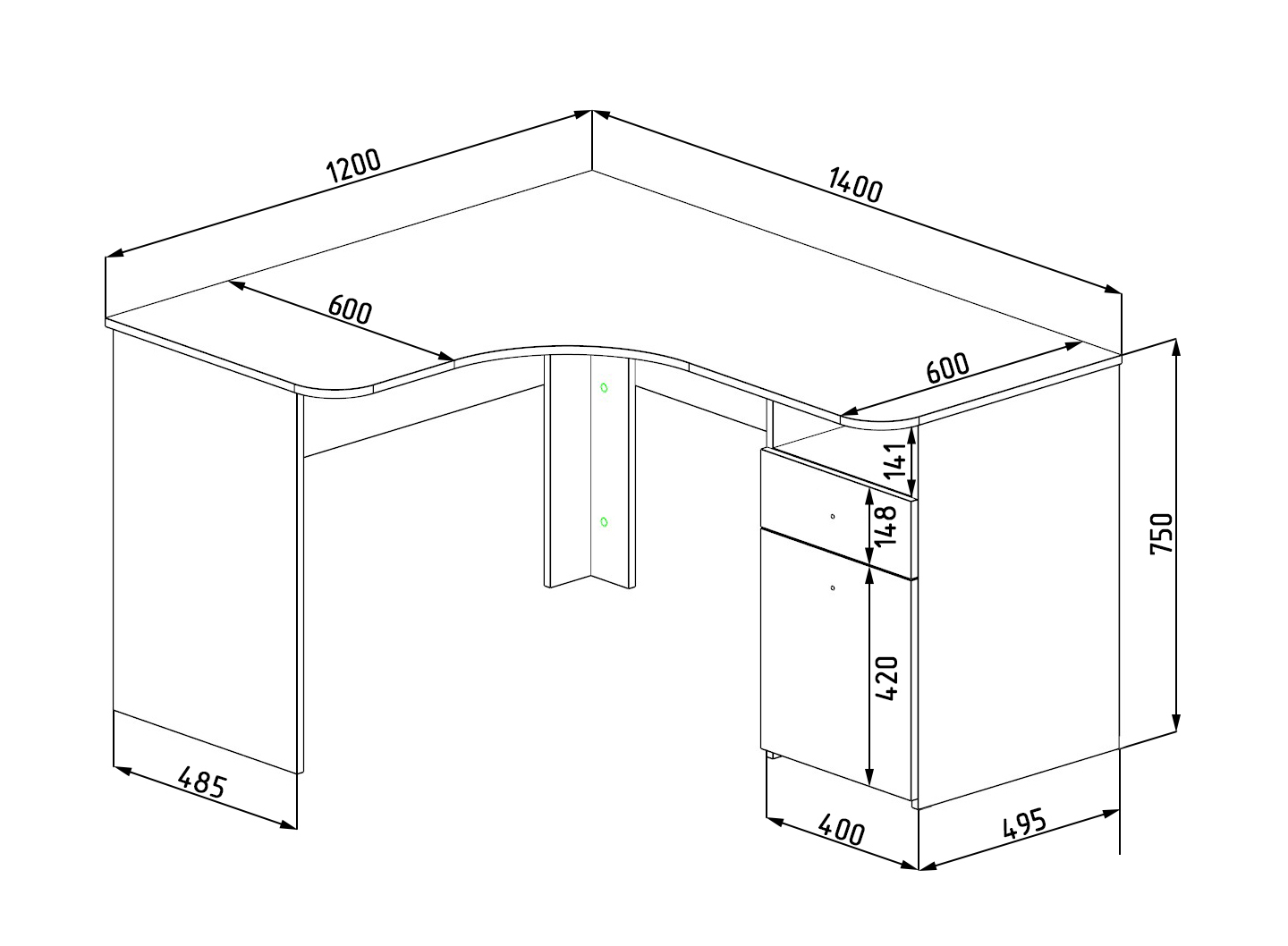 Габариты стола: ширина 1400 х высота 750 х глубина 1200 мм