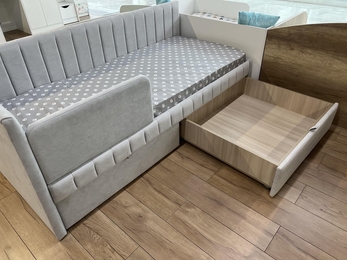 Кровать разработана с учетом требований к безопасности ребенка, сглаженные, мягкие углы, прочная конструкция и безопасные, гипоаллергенные материалы.