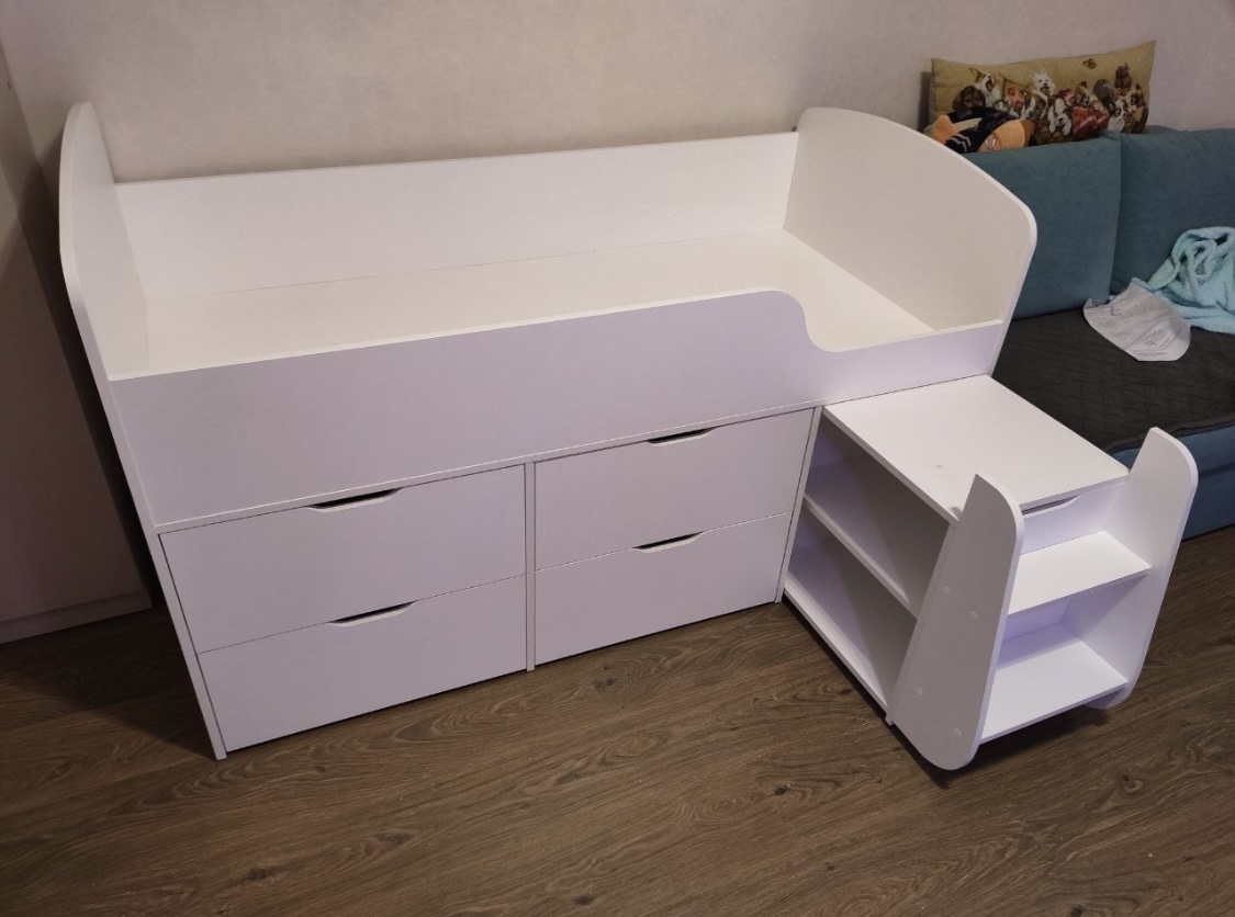Безопасный, высокий бортик, удобная выдвижная лестница с внутренними полочками и небольшая высота кровати сделаны специально для детей младшего возраста.