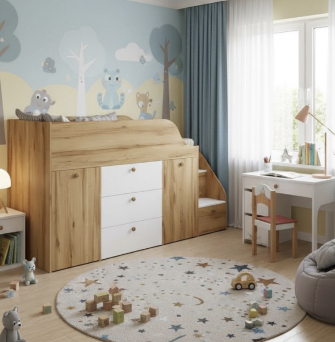Функциональная кровать с удобной лестницей и множеством мест для хранения детских вещей.