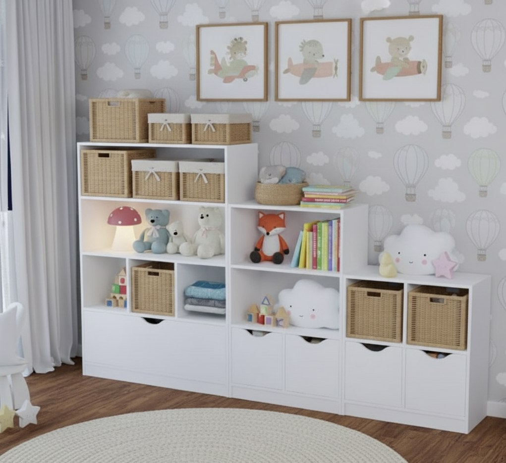 Коробки для игрушек не входят в стоимость стеллажей