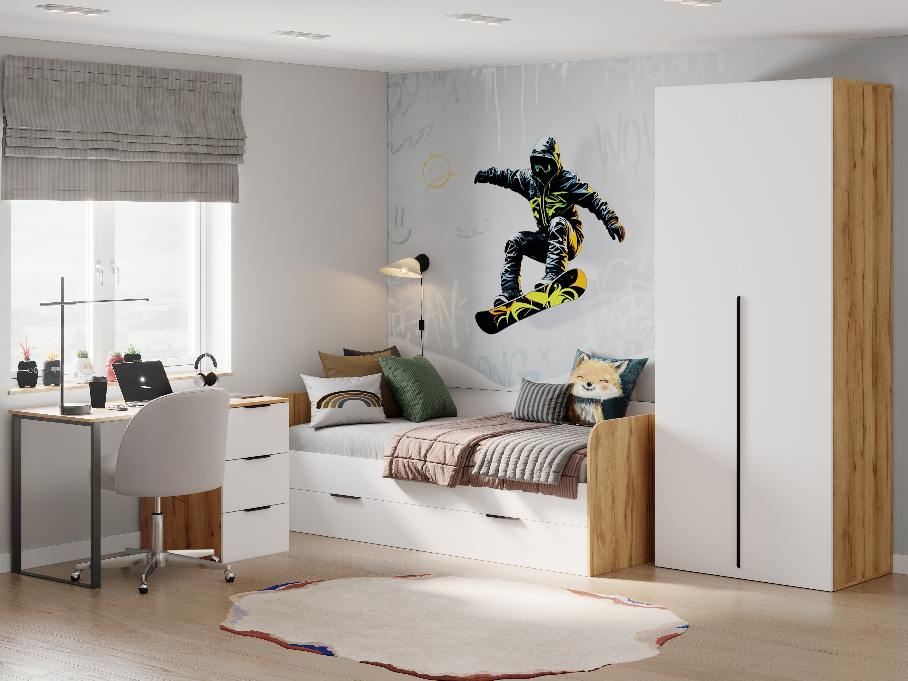 корпус белый + фасады графит, корпус белый + фасады дуб золотистый, корпус дуб золотистый + фасады графит, полностью белый или полностью велюр