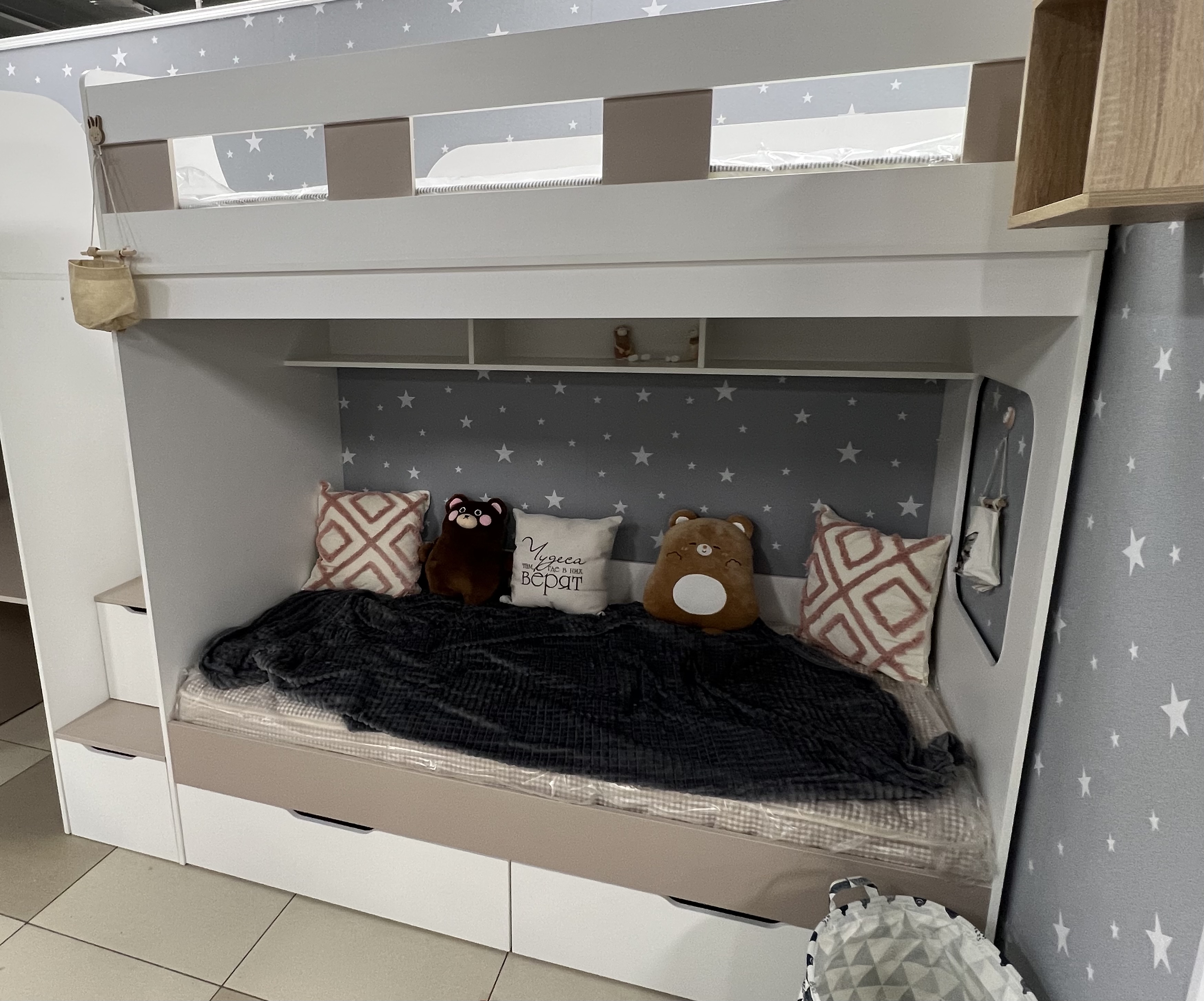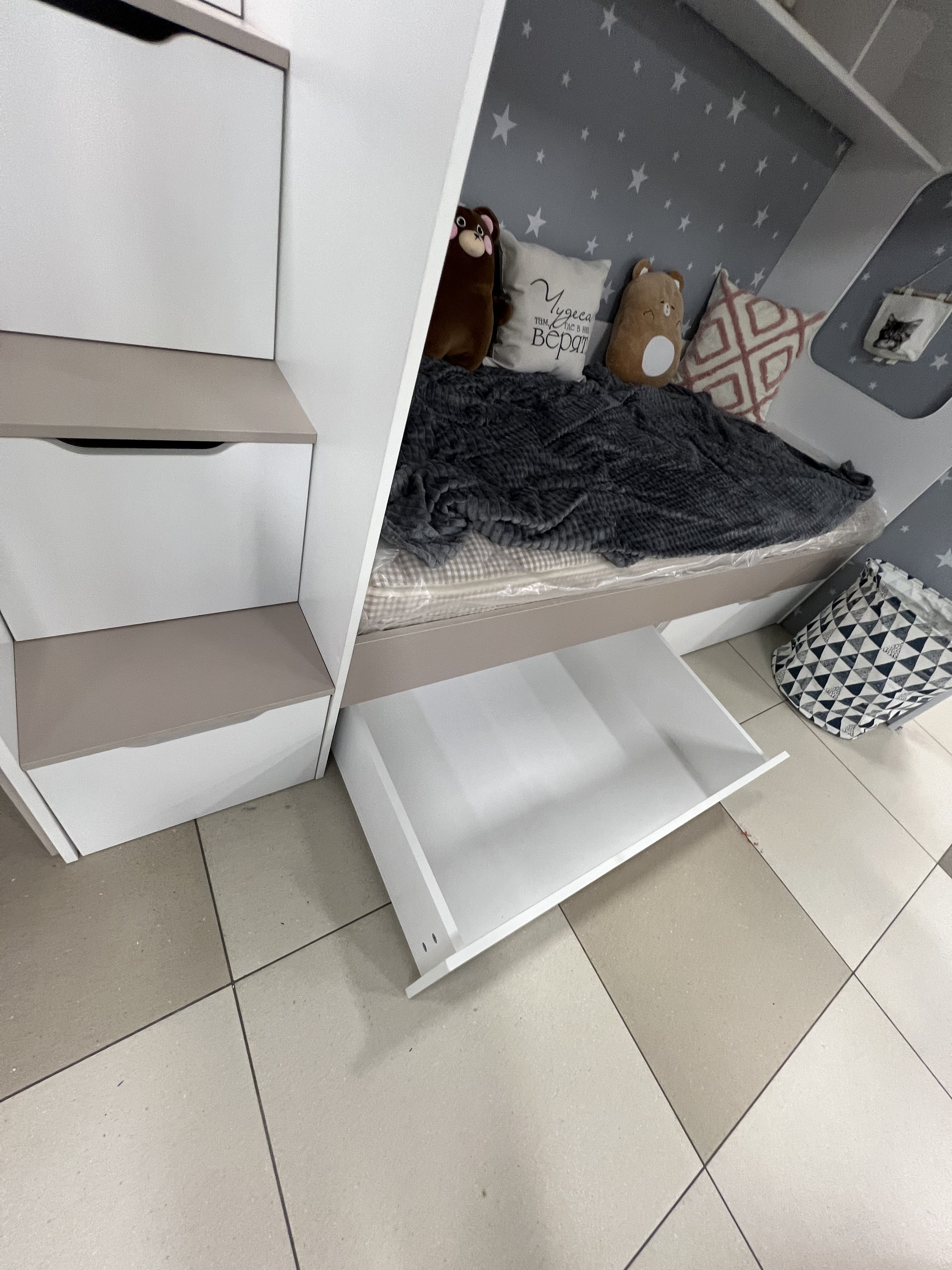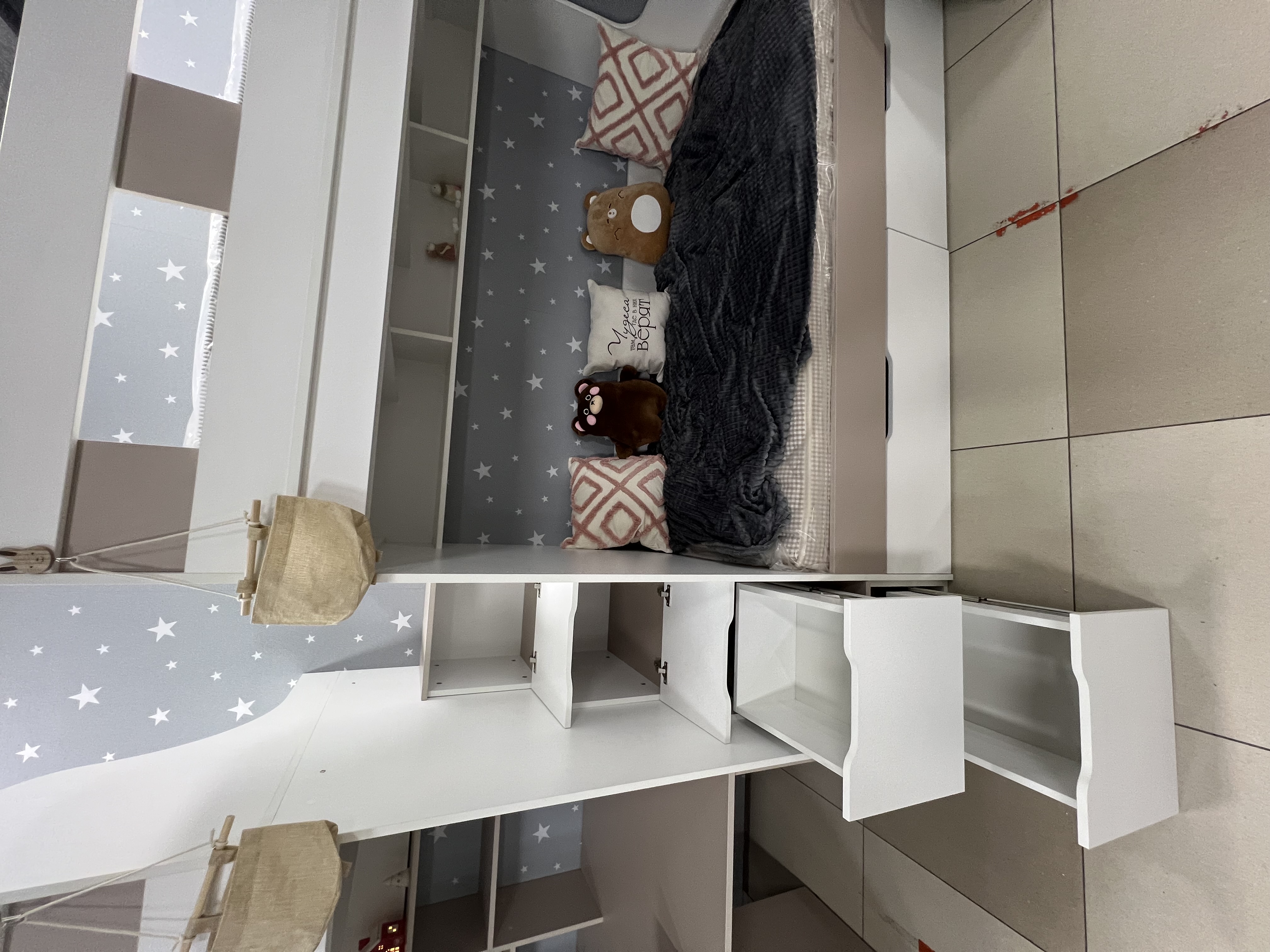 - Максимальная экономия пространства: кровать освобождает место для игр и учебы, сохраняя при этом уют и комфорт.